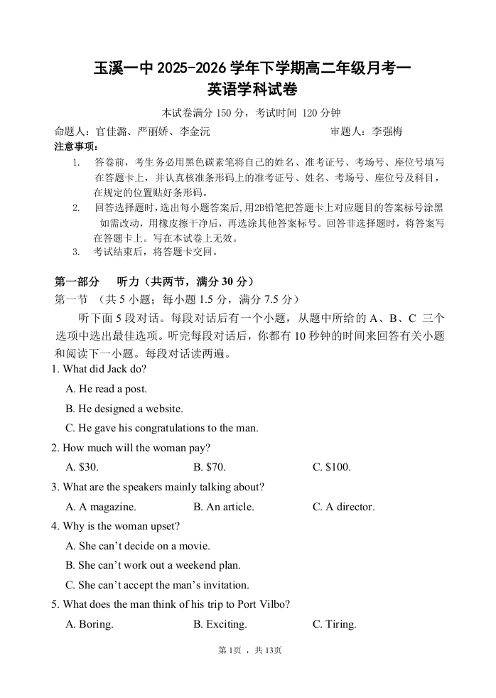 玉溪一中2025-2026学年下学期高二年级月考一 英语.docx