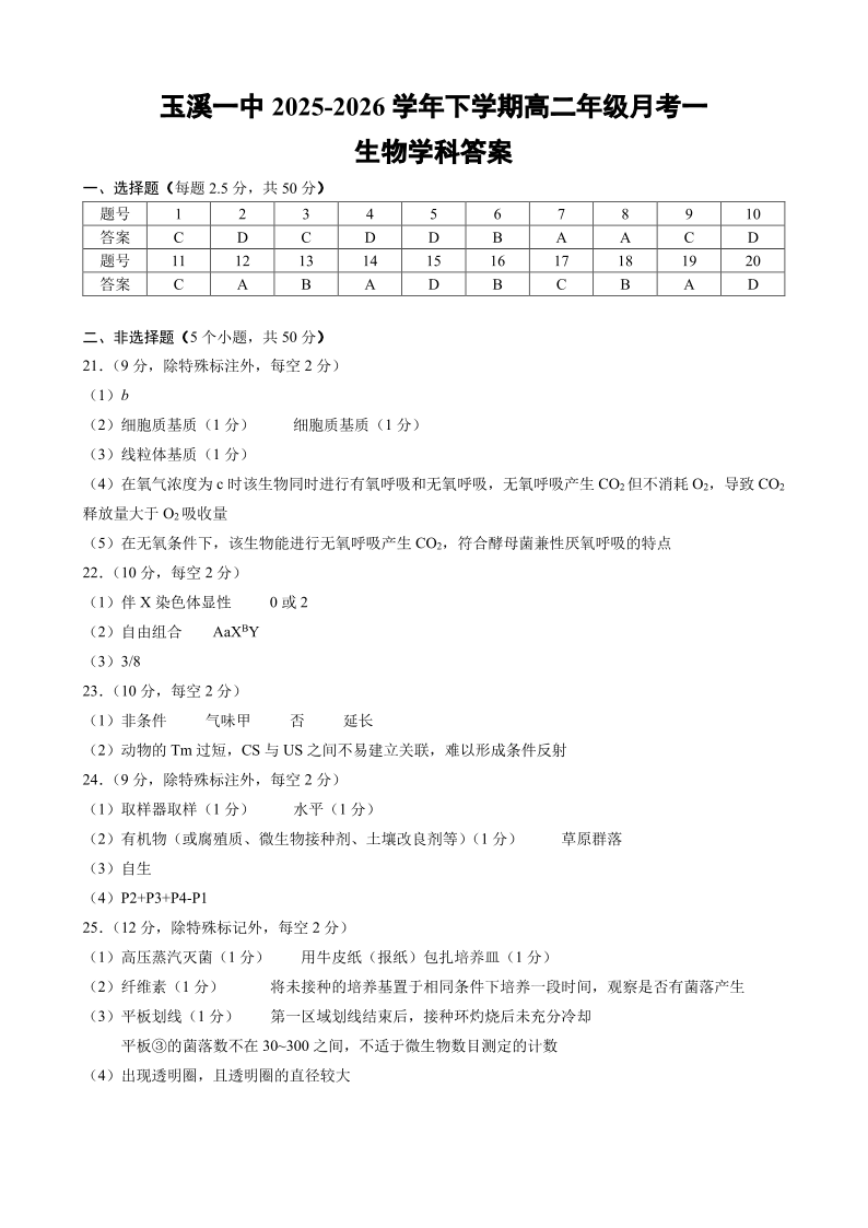 玉溪一中2025-2026学年下学期高二年级月考一 生物答案.pdf