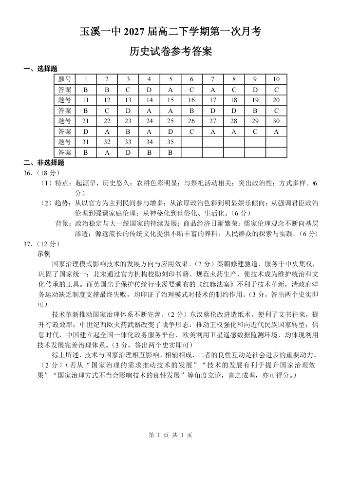 玉溪一中2025-2026学年下学期高二年级月考一 历史答案.docx