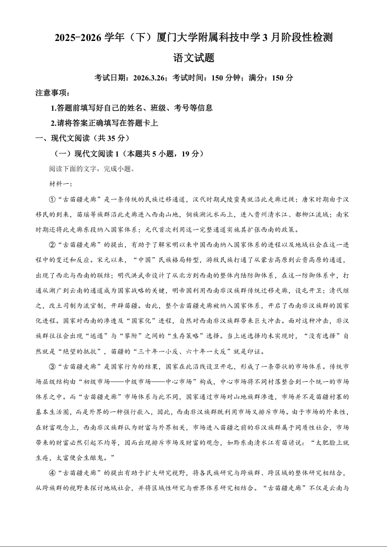 福建厦门大学附属科技中学2025-2026学年高二下学期3月阶段测试 语文答案.docx