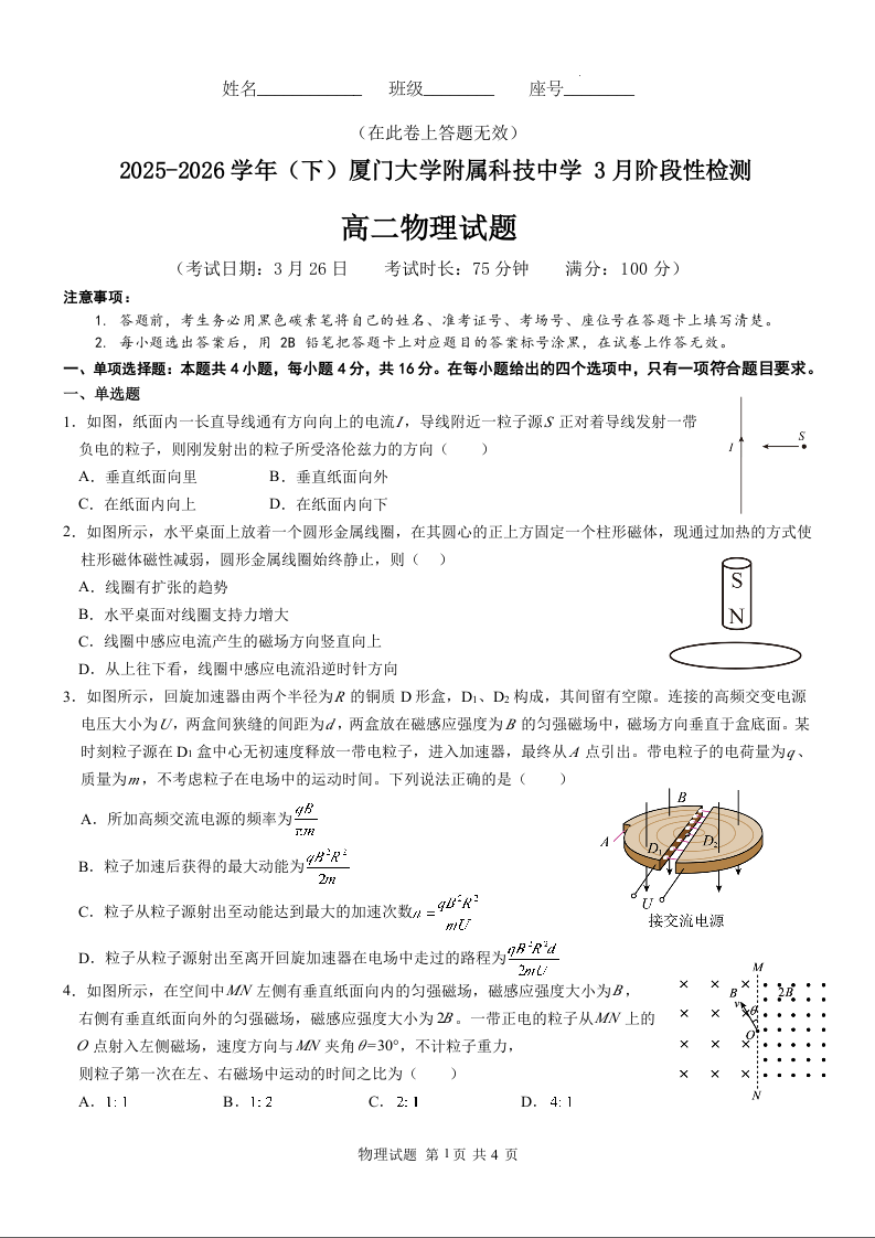 福建厦门大学附属科技中学2025-2026学年高二下学期3月阶段测试 物理试题(含答案).docx
