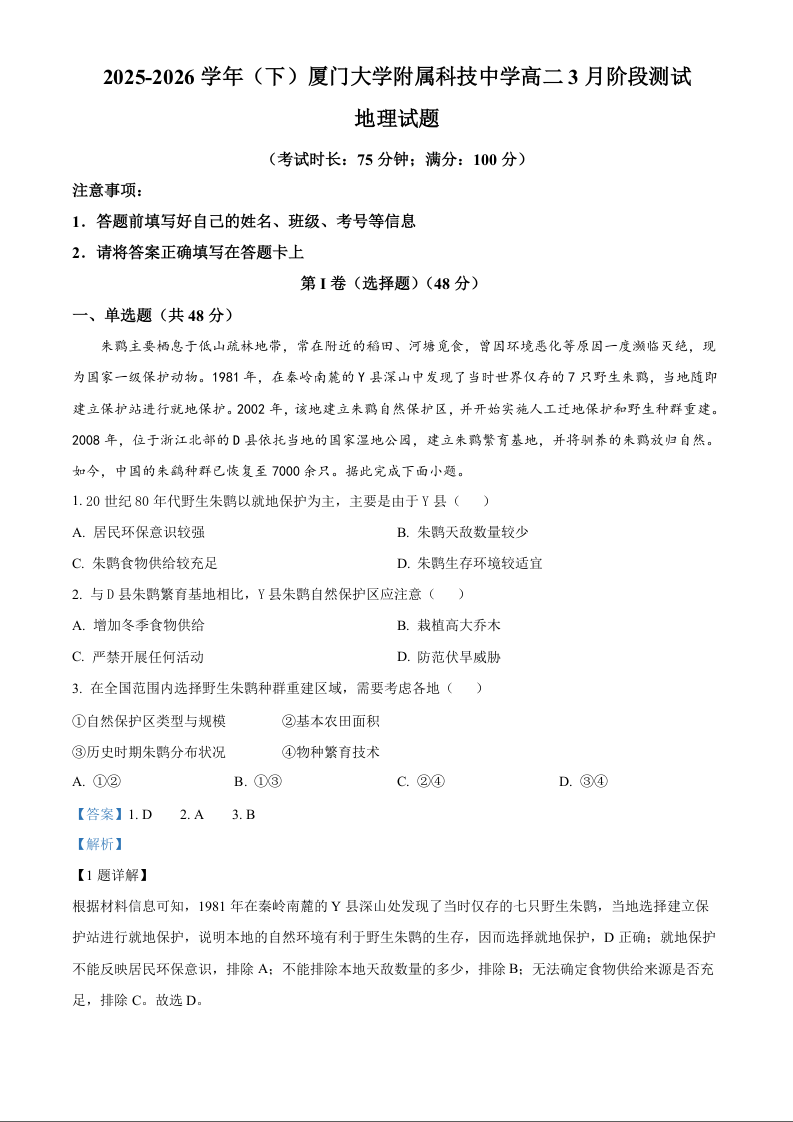 福建厦门大学附属科技中学2025-2026学年高二下学期3月阶段测试 地理答案.docx