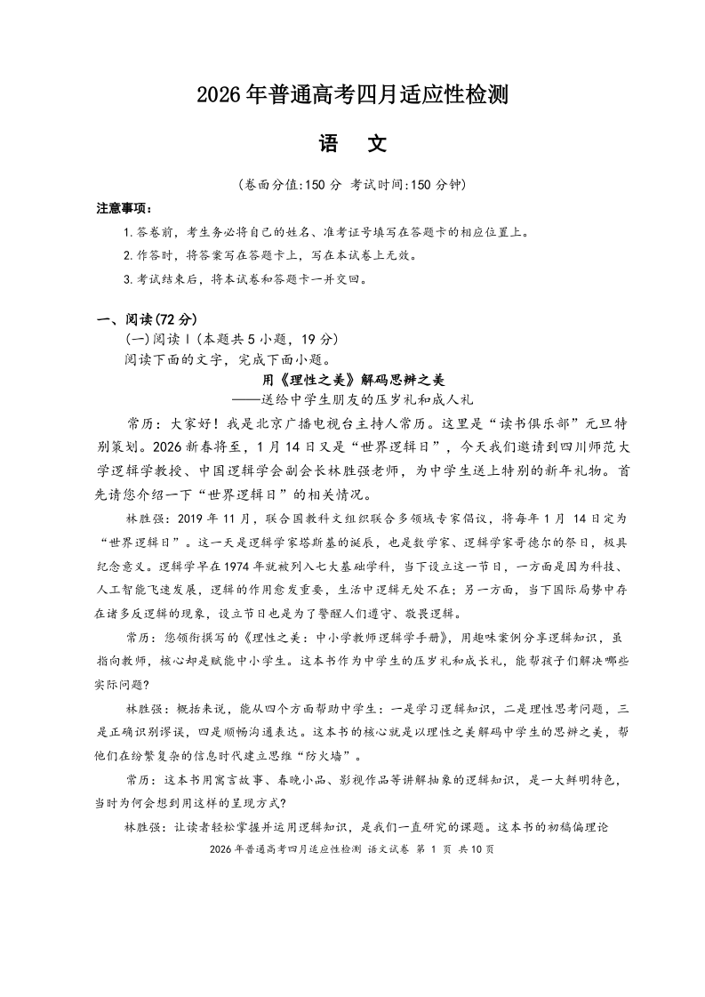 2026年普通高考四月适应性检测 语文.doc