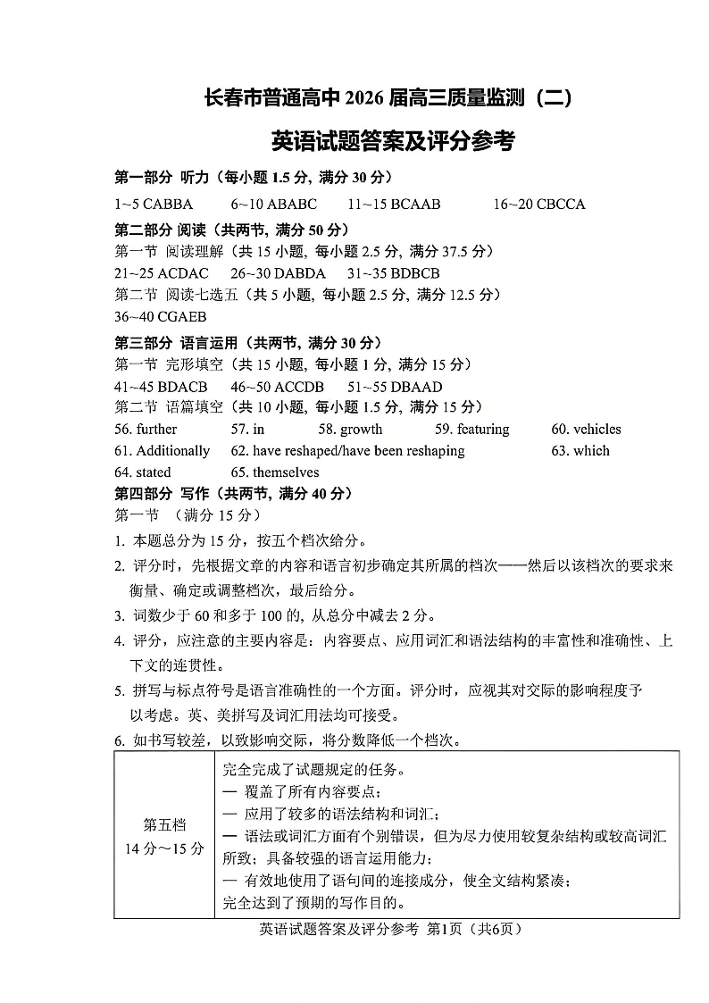 吉林省长春市2026届高三年级质量监测(二)英语答案.pdf