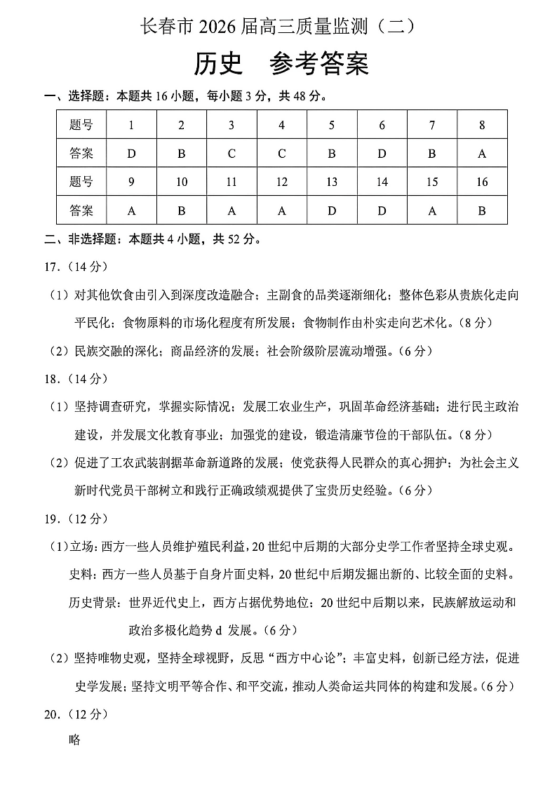 吉林省长春市2026届高三年级质量监测(二)历史答案.pdf