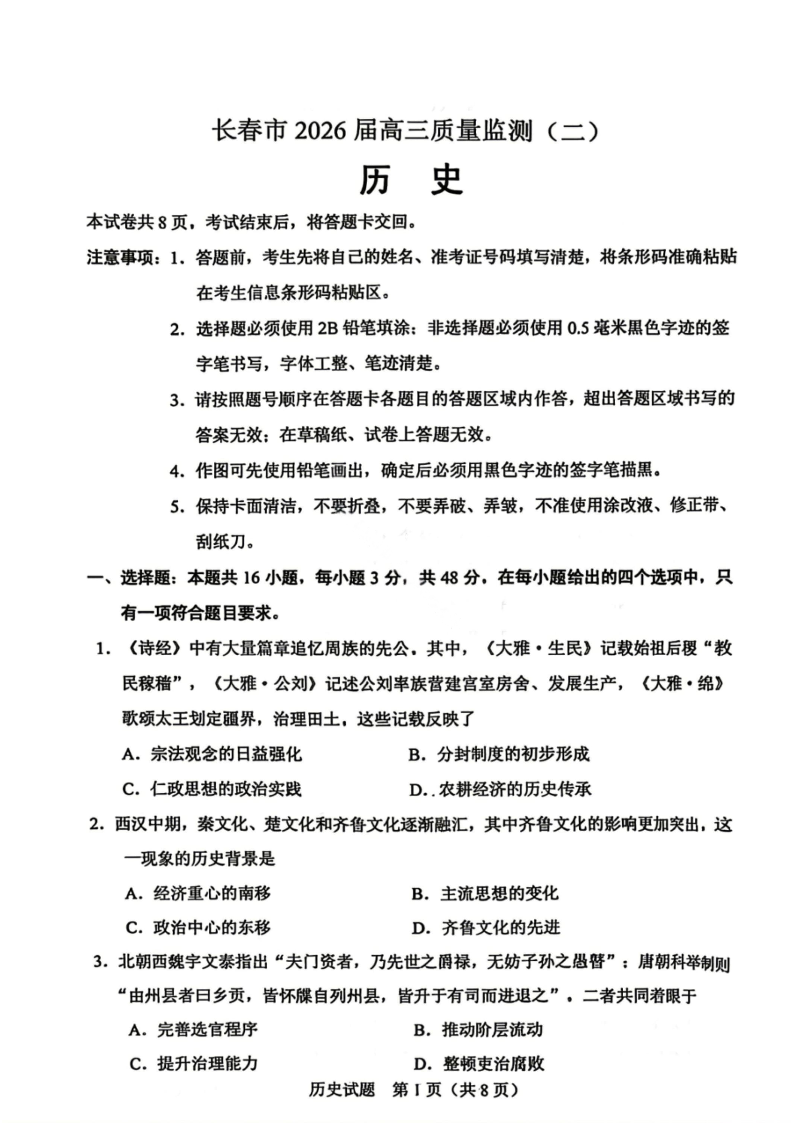 吉林省长春市2026届高三年级质量监测(二)历史.pdf