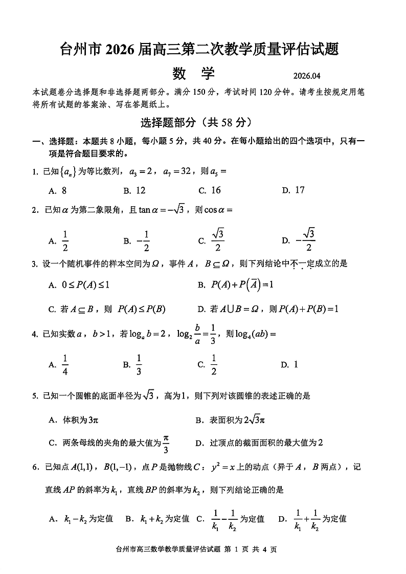 台州市2026届高三第二次教学质量评估试题 数学.pdf
