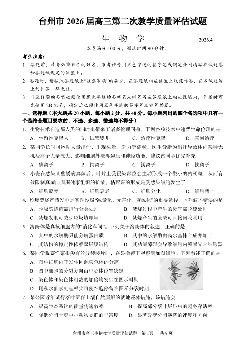 台州市2026届高三第二次教学质量评估试题 生物.pdf