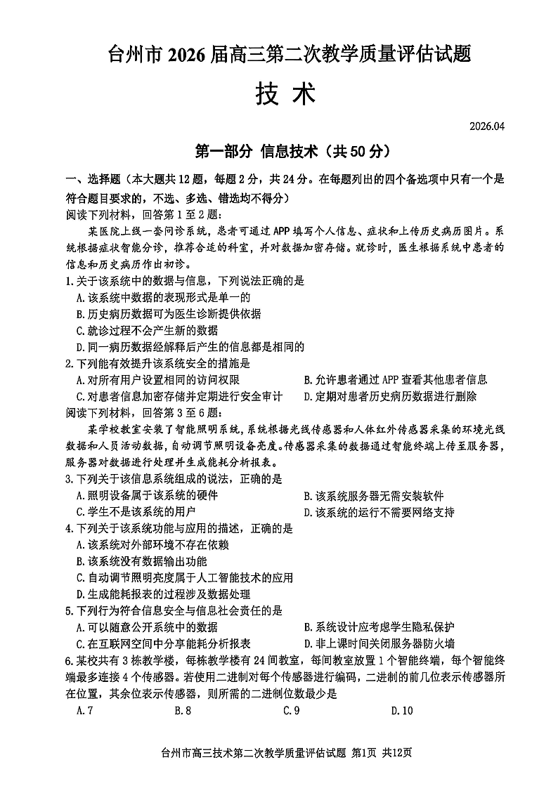 台州市2026届高三第二次教学质量评估试题 技术.pdf