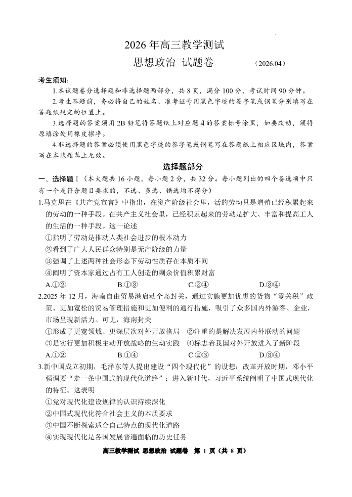 浙江省嘉兴市2026届高三下学期4月教学测试(嘉兴二模)政治.pdf