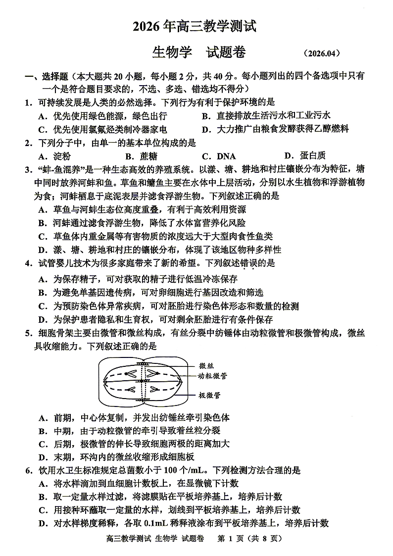 浙江省嘉兴市2026届高三下学期4月教学测试(嘉兴二模)生物.pdf