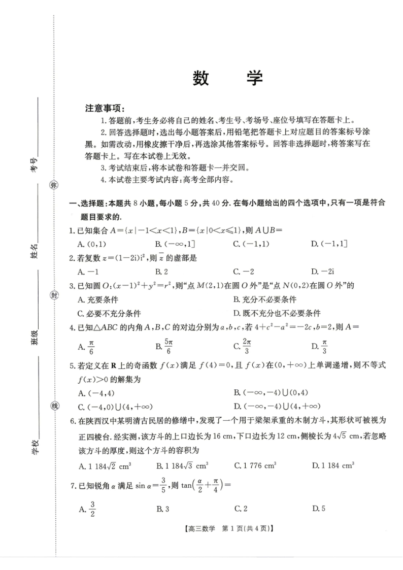汉中市2026届普通高中高三年级第二次教学质量检测考试 数学试题(含答案).pdf
