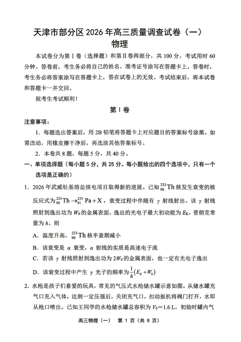 天津市部分区2026年高三质量调查试卷(一)物理试题(含答案).pdf