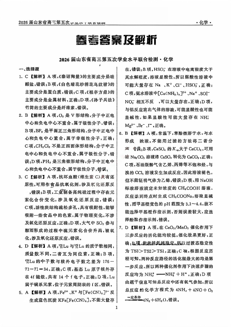 齐鲁名校大联考2026届山东省高三年级第五次学业水平联合检测 化学答案.pdf