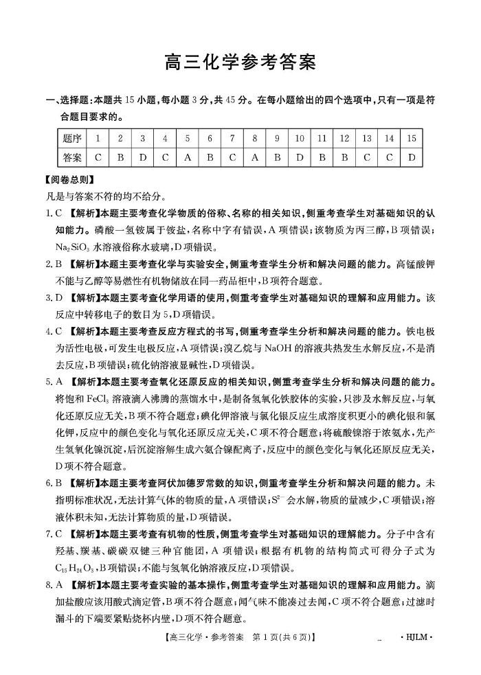 辽宁省抚顺市六校协作体2026届高三下学期一模考试 化学答案.pdf