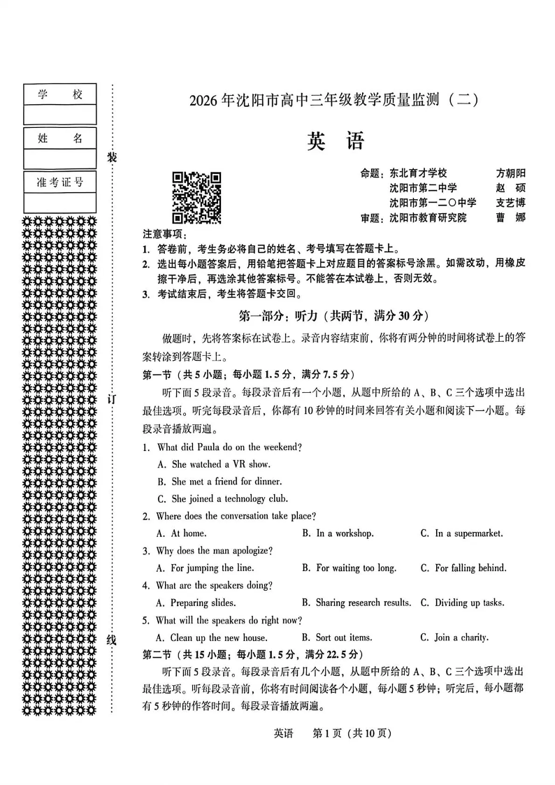 2026年沈阳市高中三年级教学质量监测(二)英语.pdf