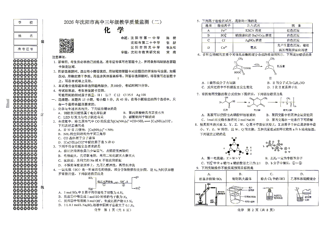 2026年沈阳市高中三年级教学质量监测(二)化学.pdf