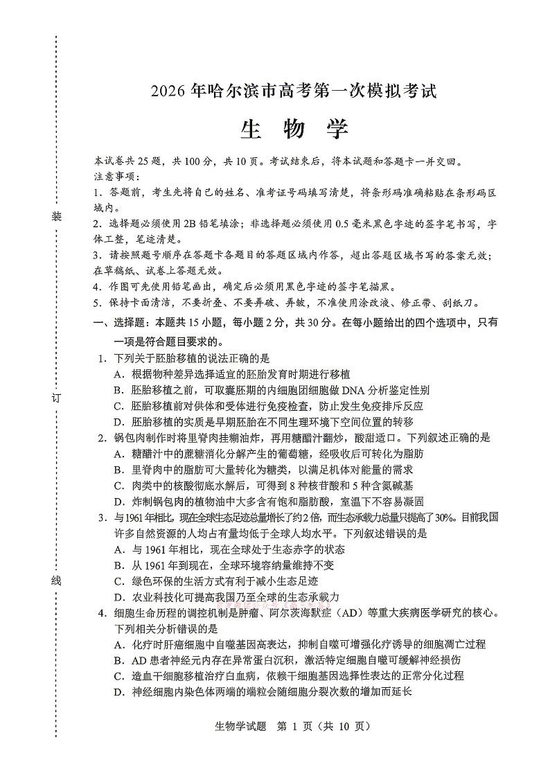 2026年哈尔滨市高考第一次模拟考试 生物.pdf