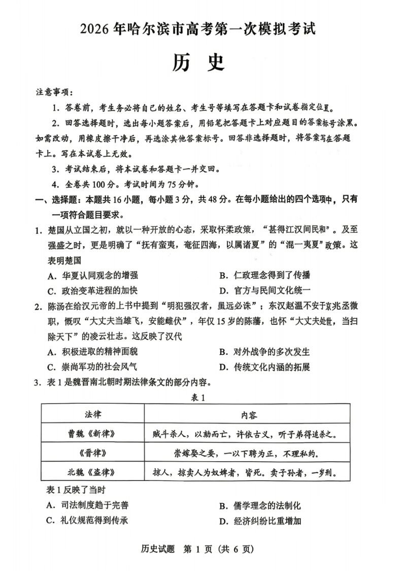 2026年哈尔滨市高考第一次模拟考试 历史.pdf