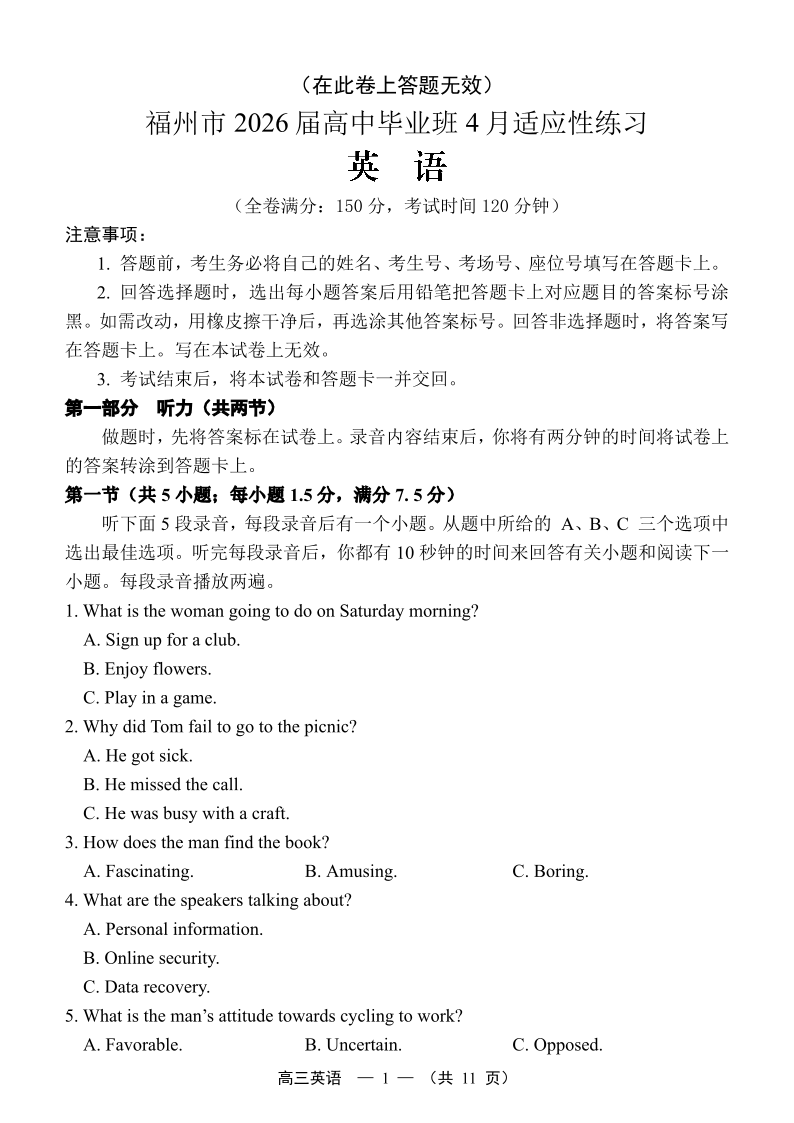 福州市2026届高中毕业班高三年级4月适应性练习 英语.pdf