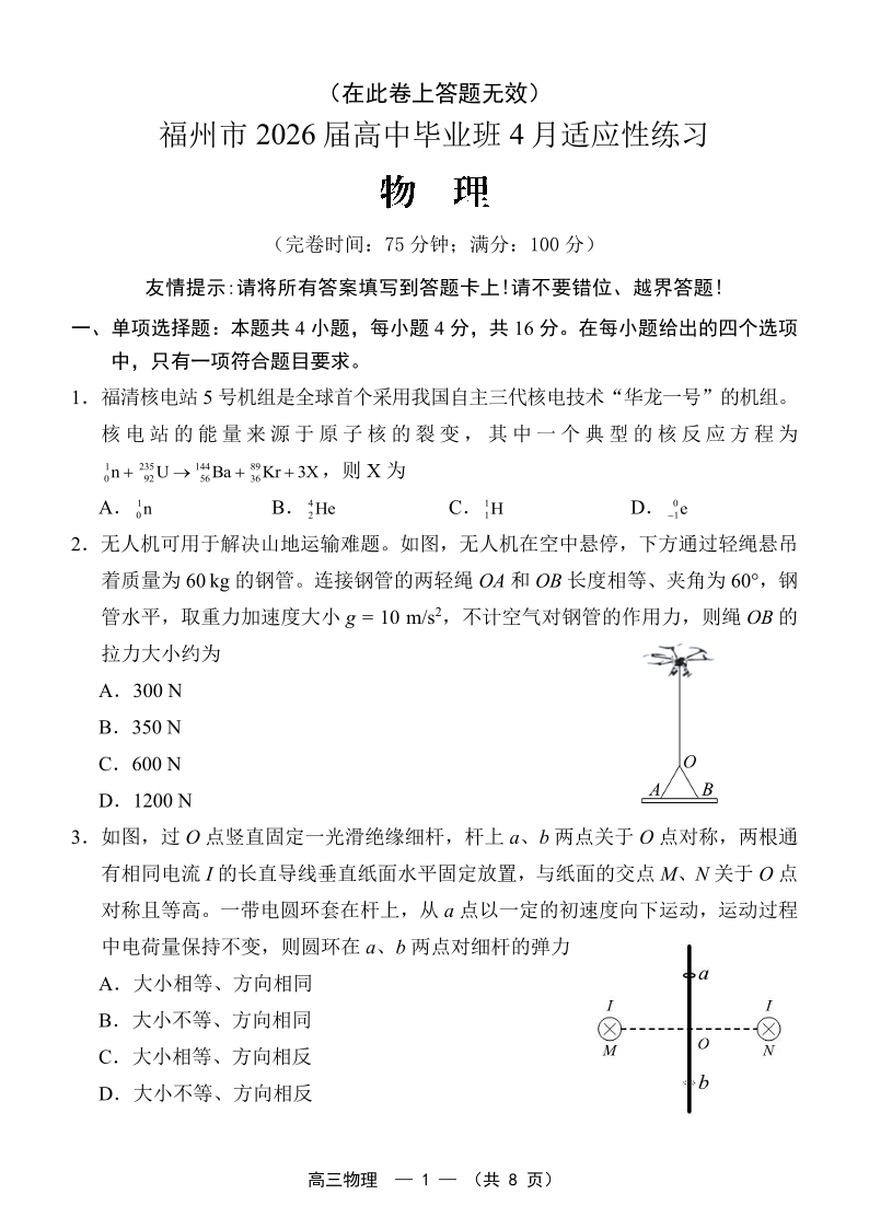 福州市2026届高中毕业班高三年级4月适应性练习 物理.pdf