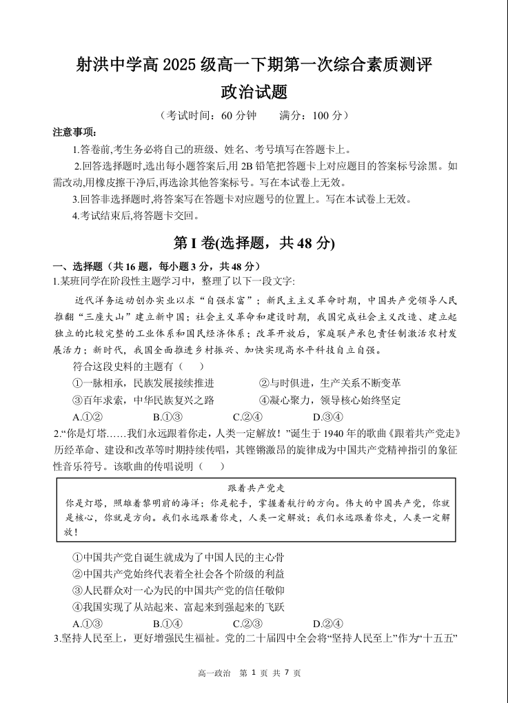 遂宁市射洪中学2025-2026学年高一下学期第一次综合素质测评 政治.docx