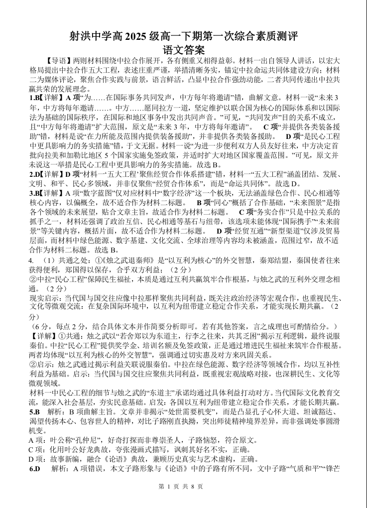 遂宁市射洪中学2025-2026学年高一下学期第一次综合素质测评 语文答案.docx