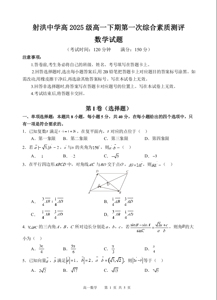 遂宁市射洪中学2025-2026学年高一下学期第一次综合素质测评 数学.docx