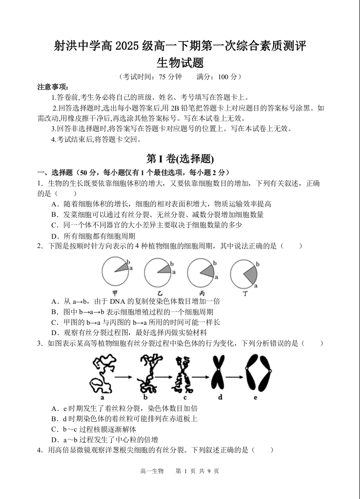 遂宁市射洪中学2025-2026学年高一下学期第一次综合素质测评 生物.doc