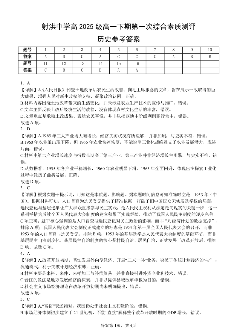 遂宁市射洪中学2025-2026学年高一下学期第一次综合素质测评 历史答案.docx