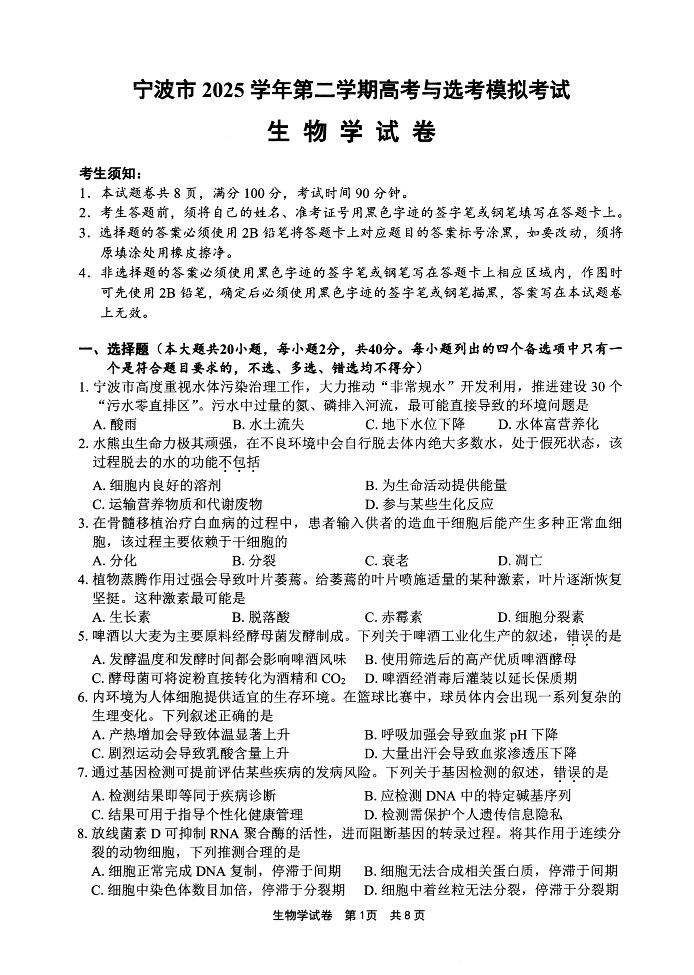 宁波市2025学年第二学期高考模拟考试 生物.pdf