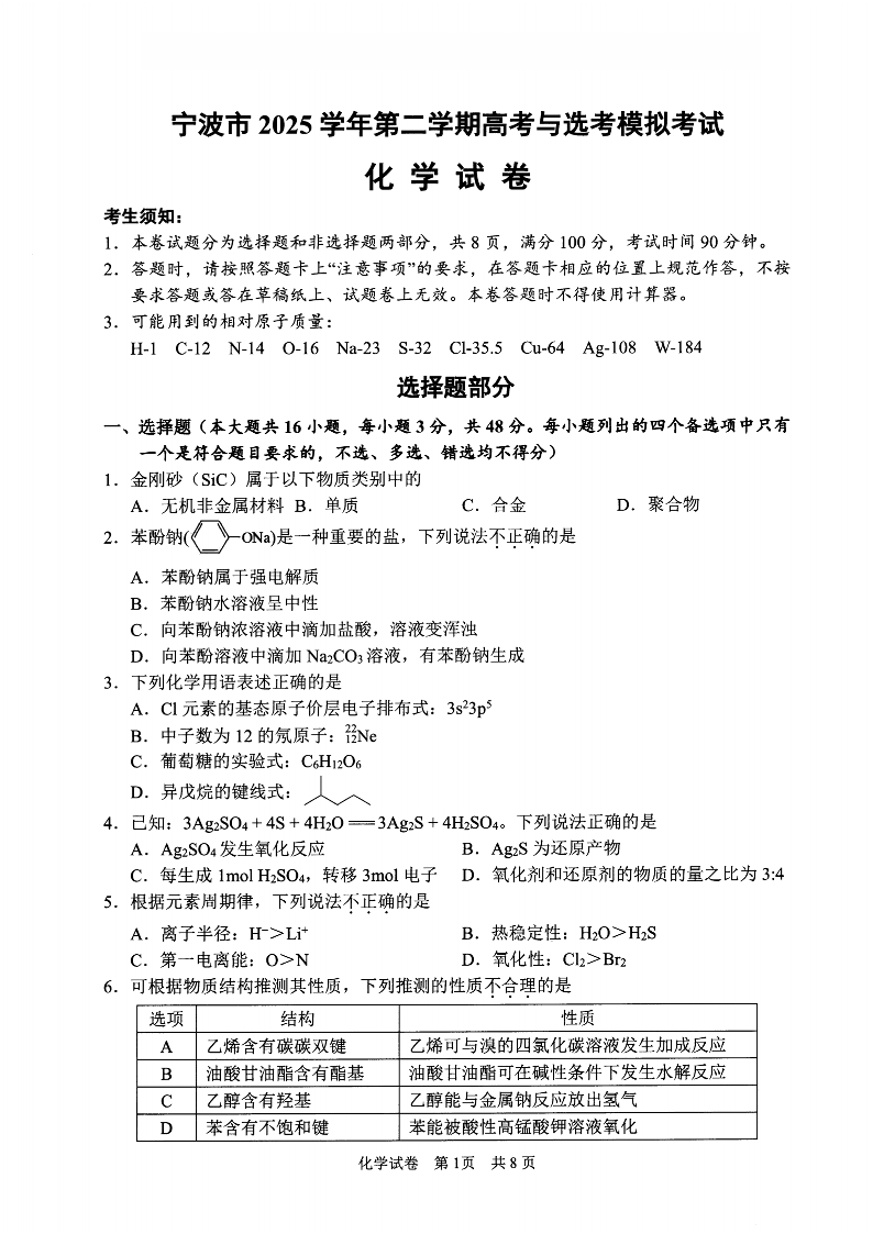 宁波市2025学年第二学期高考模拟考试 化学.pdf