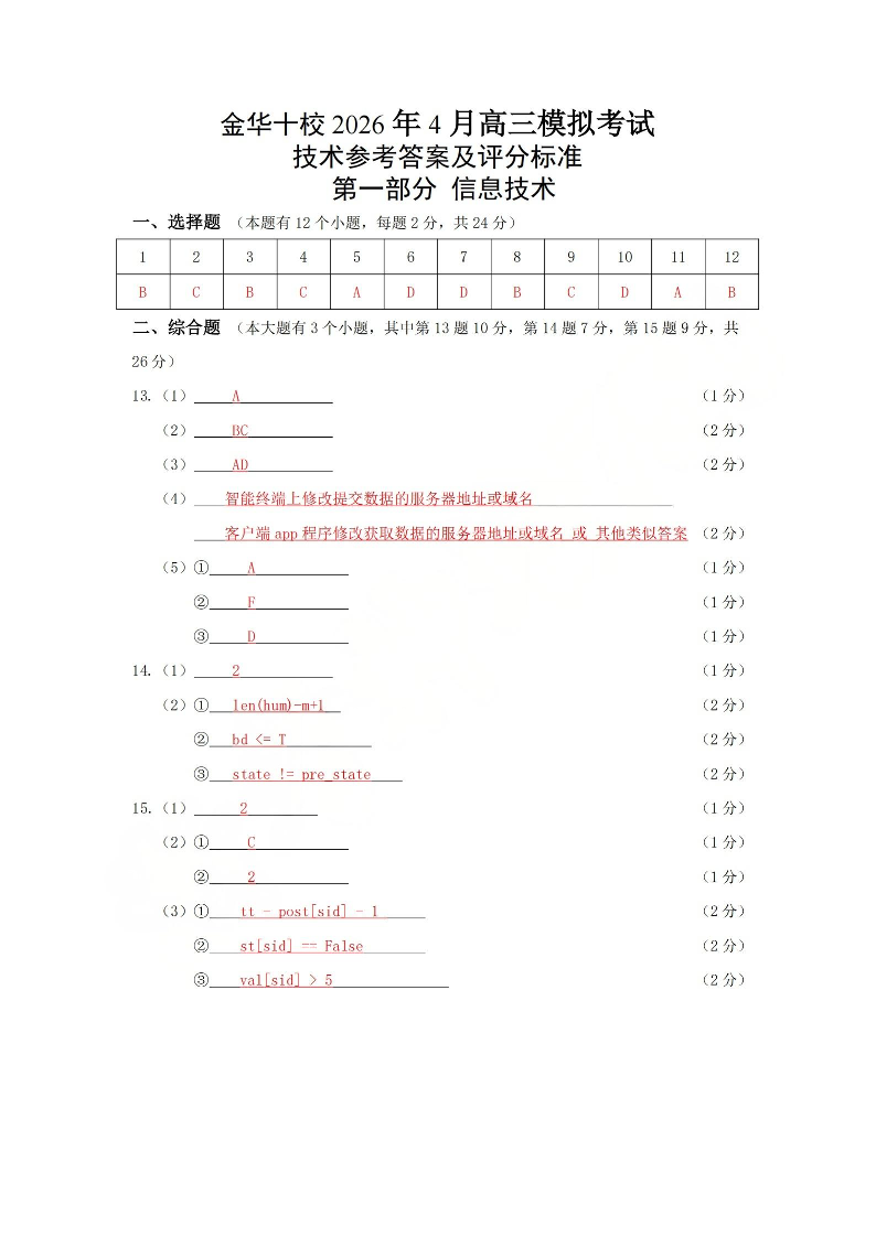 金华十校2026年4月高三模拟考试 技术答案.pdf