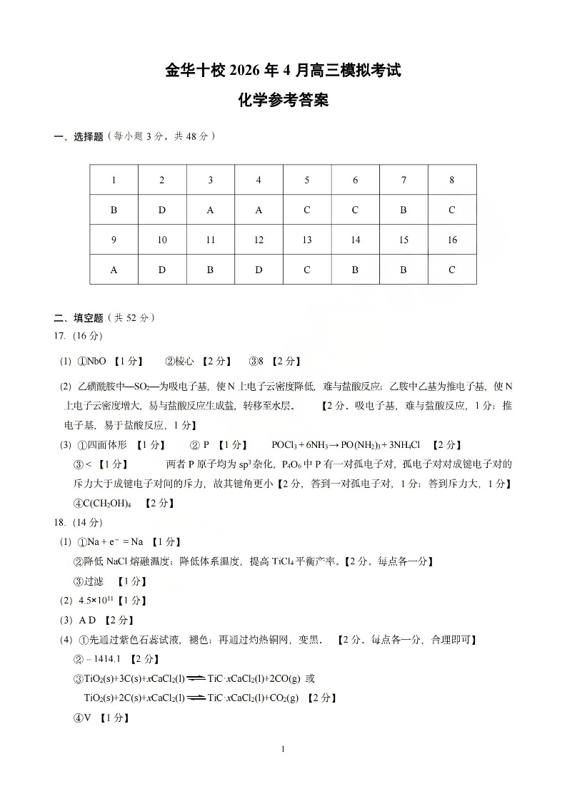 金华十校2026年4月高三模拟考试 化学答案.pdf