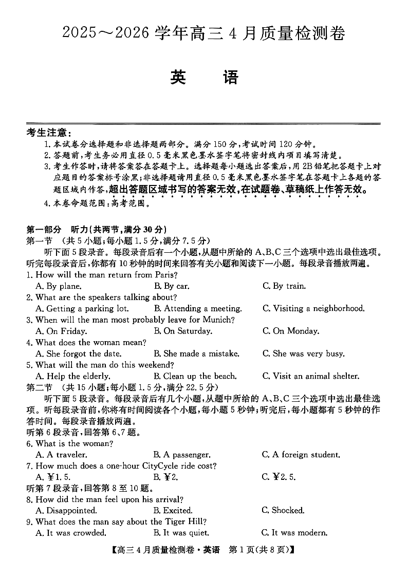 山西省卓越联盟2025~2026学年高三4月质量检测卷 英语.pdf