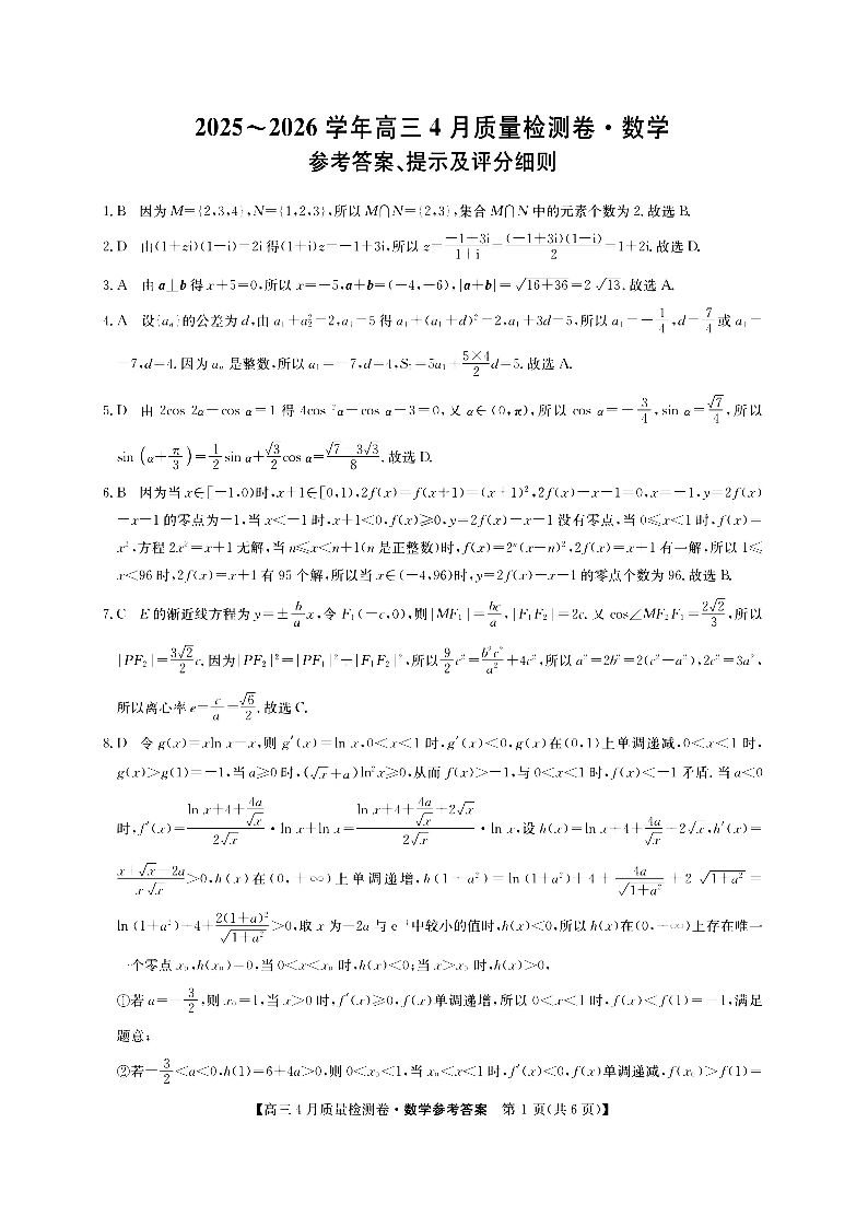 山西省卓越联盟2025~2026学年高三4月质量检测卷 数学答案.pdf