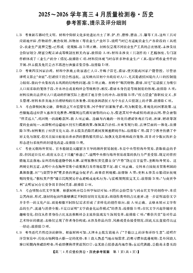 山西省卓越联盟2025~2026学年高三4月质量检测卷 历史答案.pdf