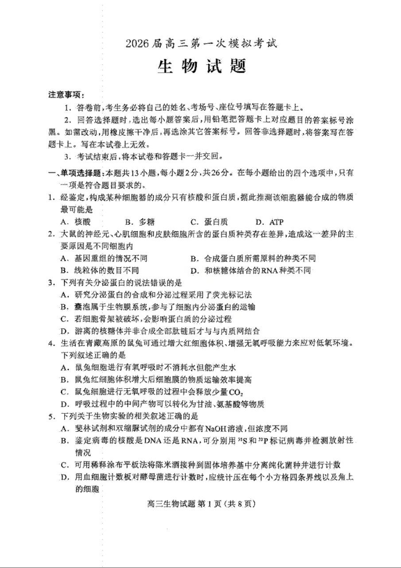 河北省保定市2026届高三年级第一次模拟考试 生物.docx