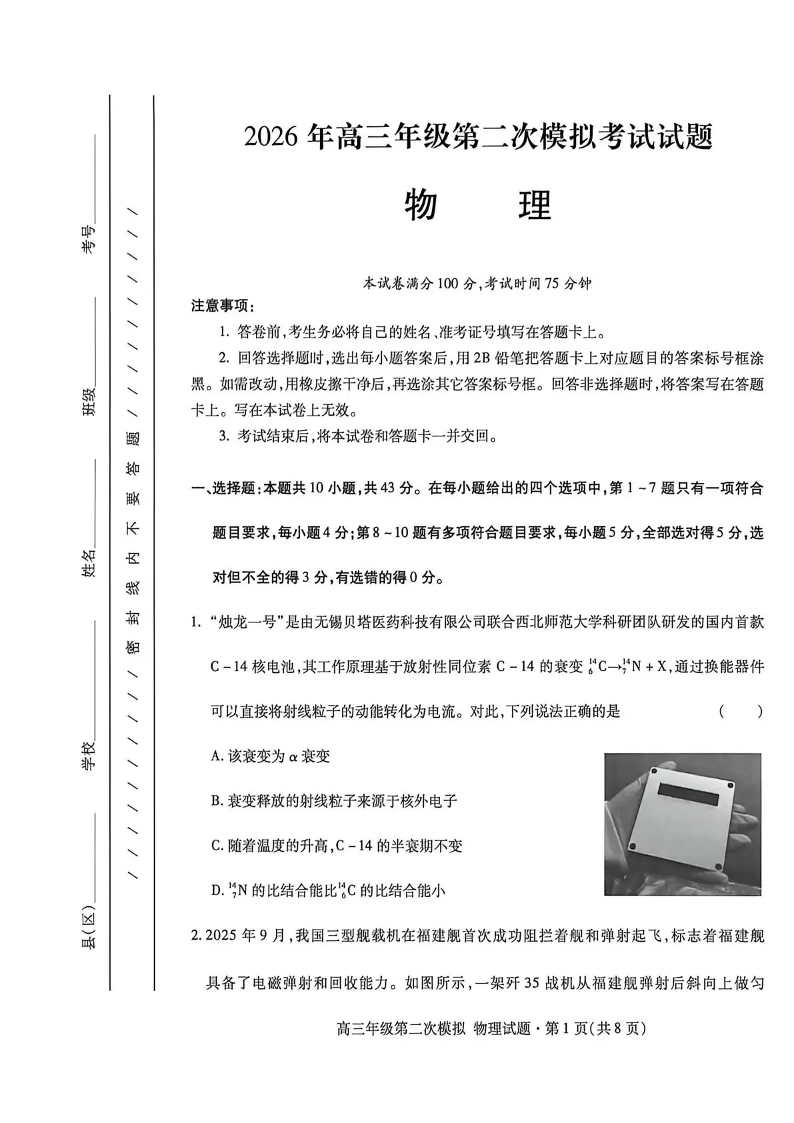 2026年高三年级第二次模拟考试试题 物理.pdf
