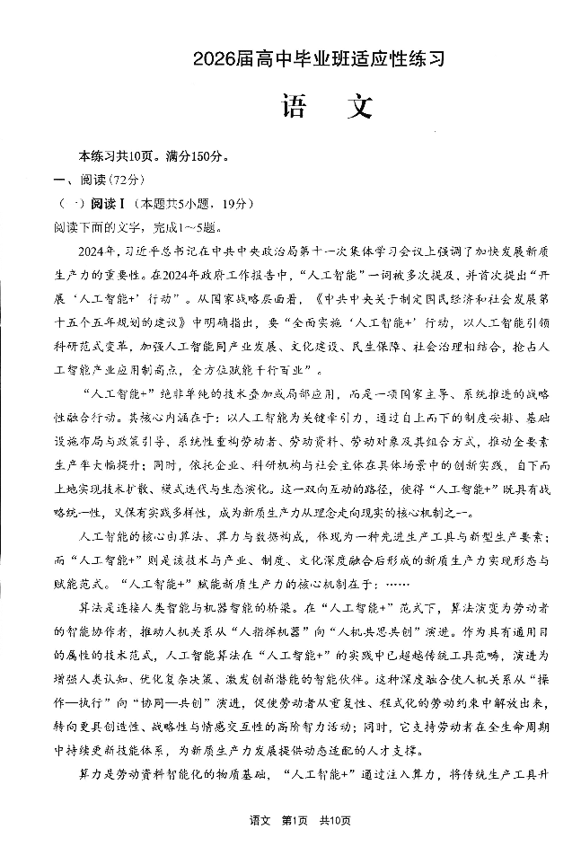 2026届高中毕业班适应性练习 语文.pdf