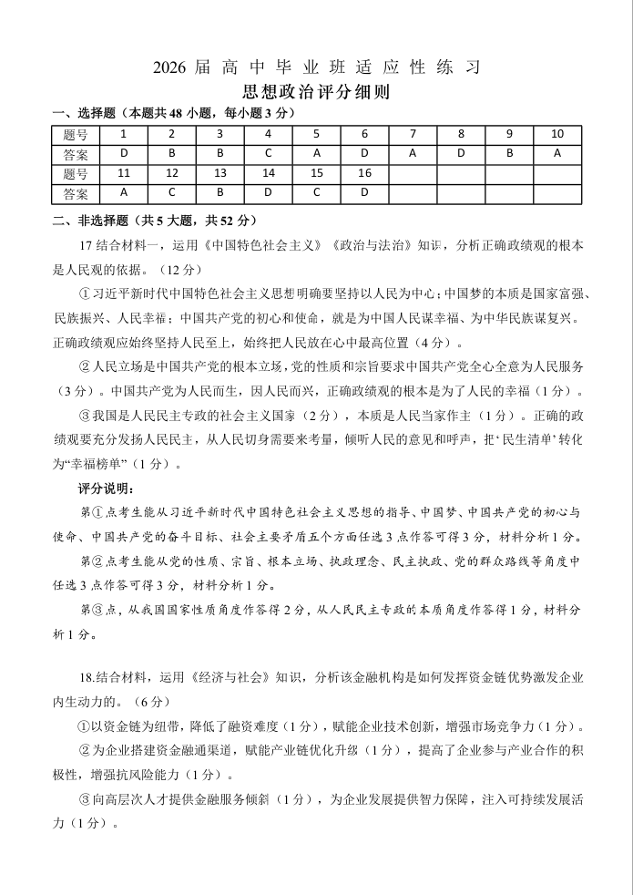 福州市2026届高中毕业班4月适应性练习 政治答案.docx