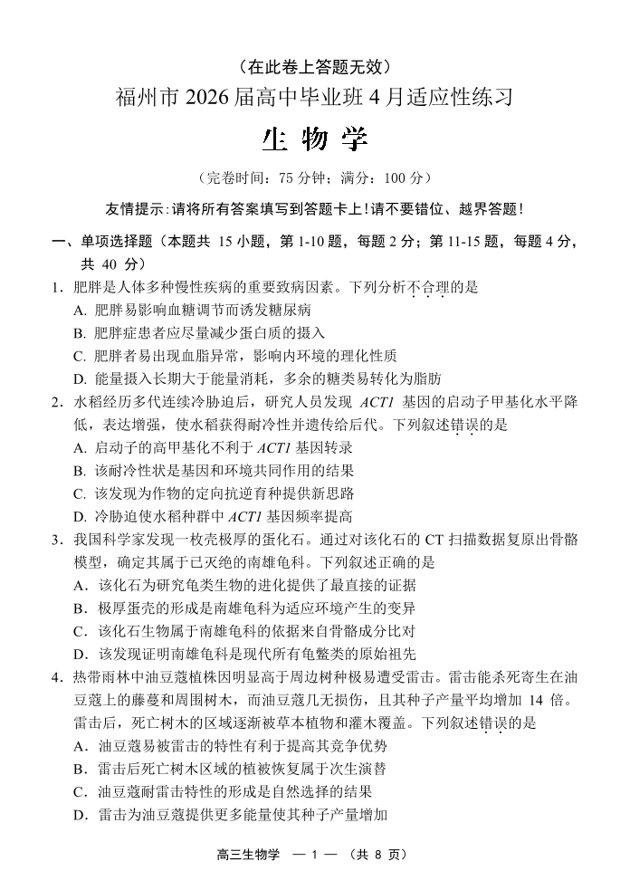 福州市2026届高中毕业班4月适应性练习 生物.pdf