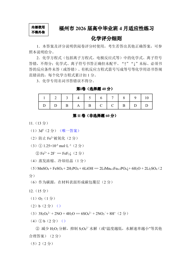 福州市2026届高中毕业班4月适应性练习 化学答案.pdf