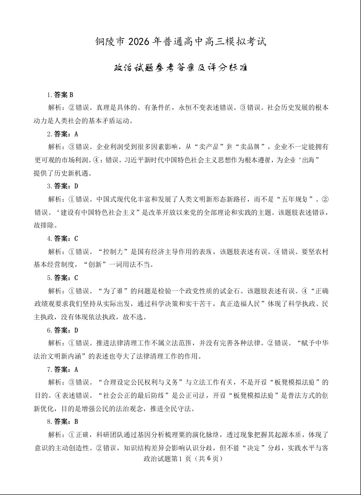 安徽省铜陵、黄山、宣城(三市二模)2026届高三4月份质量检测 政治答案.docx