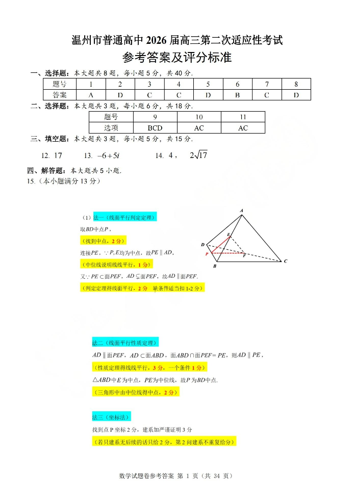 温州市普通高中2026届高三第二次适应性考试 数学答案.pdf