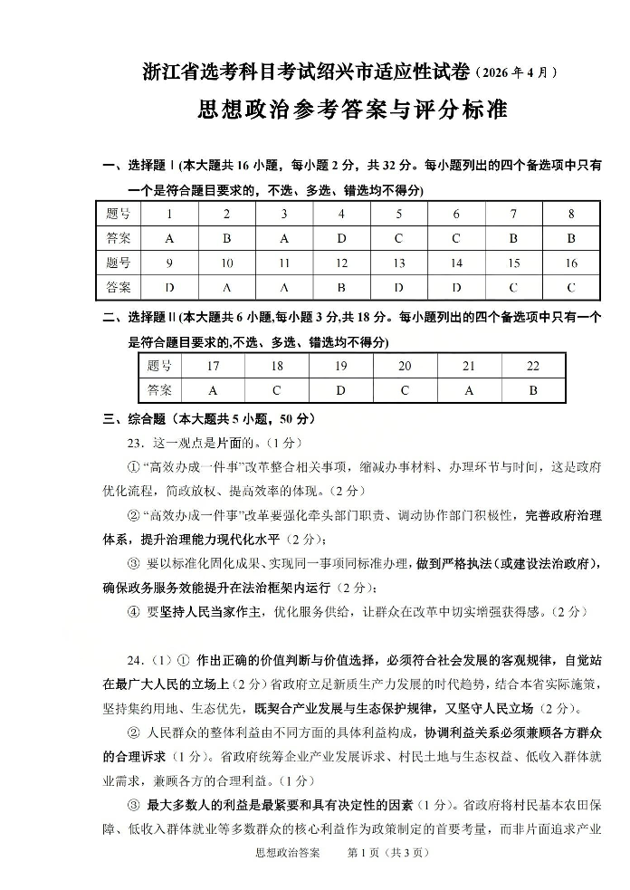 浙江省高考科目考试绍兴市适应性试卷 政治答案.pdf