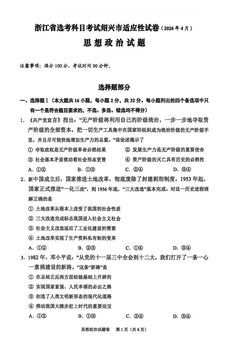 浙江省高考科目考试绍兴市适应性试卷 政治.pdf