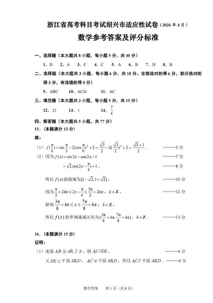 浙江省高考科目考试绍兴市适应性试卷 数学答案.pdf