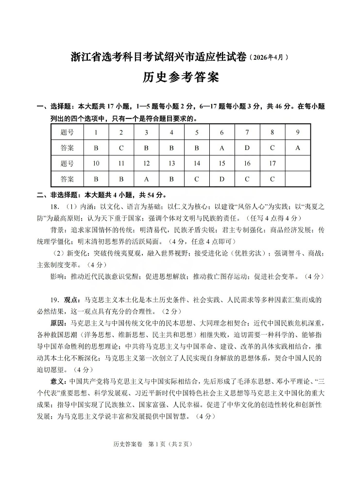 浙江省高考科目考试绍兴市适应性试卷 历史答案.pdf
