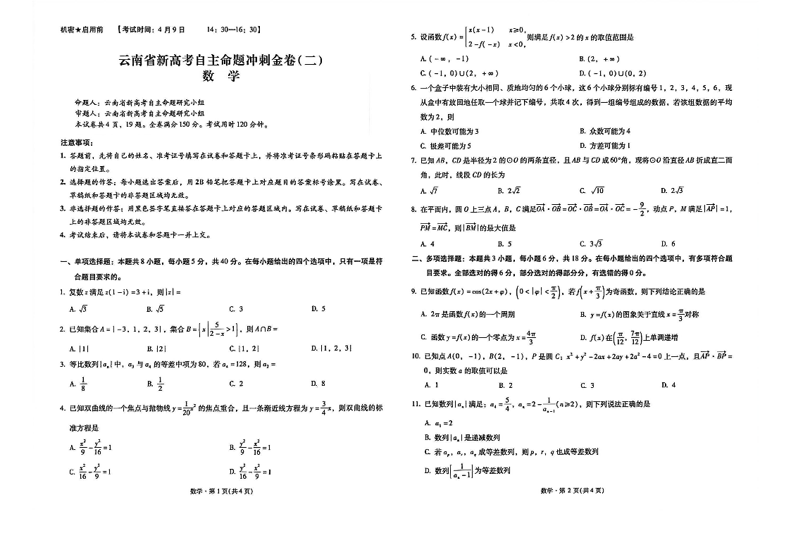 云南省新高考自主命题冲刺金卷(二)数学试题(含答案).pdf